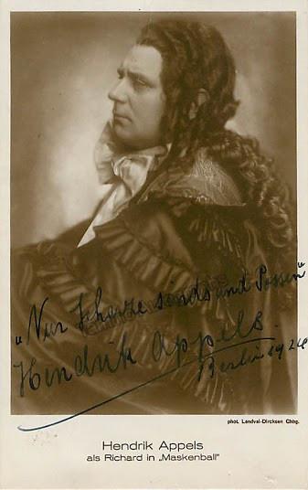 Signed photo postcard of the Dutch tenor (1886-1947), shown as Riccardo in Verdi's Un Ballo in Maschera, dated in Berlin, 1924. Size 3.5 x 5.25 inches.