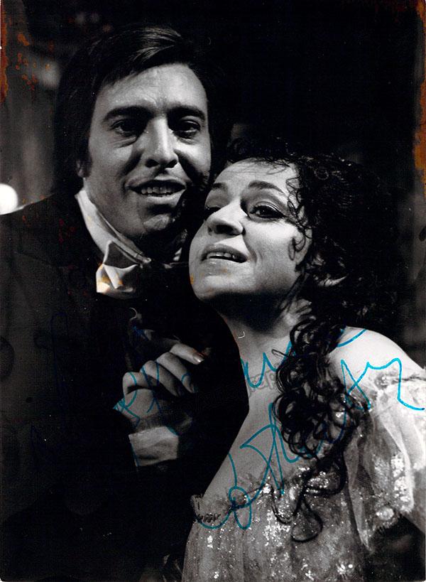 Spanish-Catalan tenor (b. 1939) and Romanian opera soprano (b. 1939), double signed photo, shown in La Traviata at the Bavarian State Opera. Photo by Felicitas Timpe, Munich. Size is 5 x 7 inches, in excellent condition.