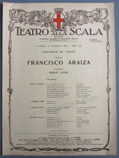 Mini-poster/playbill for a concert at Teatro La Scala, 1985, with pianist Irwin Gage. Large size, 11 x 15 inches, in excellent condition