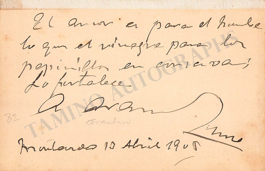 Signed album page, dated in Montevideo in 1905. Size is 4.75 x 7.25 inches, in excellent condition. Rare!