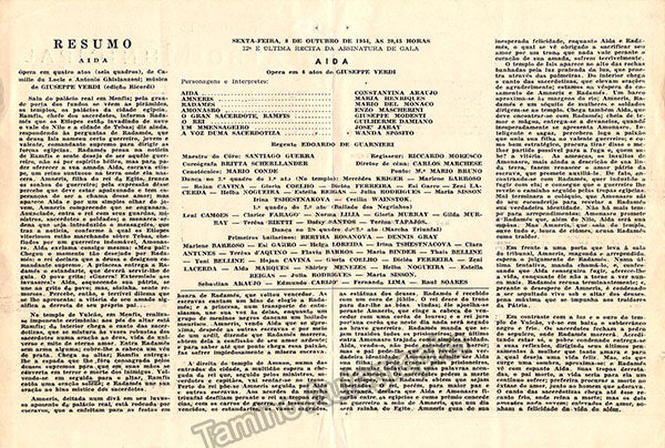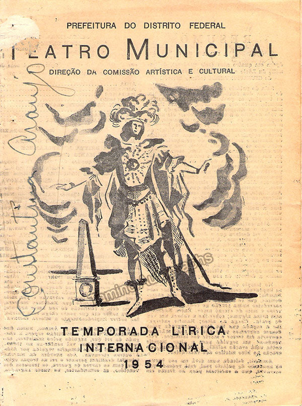 Brazilian soprano (1922-1966), signed program of a performance of Verdi's Aida presented at the Teatro Municipal in 1954 in which she undertook the title role. Signature on front cover page. 4 folded pages, 5.5 x 7.5 inches each, slight paper loss on top left of front page not affecting the signatures or text.