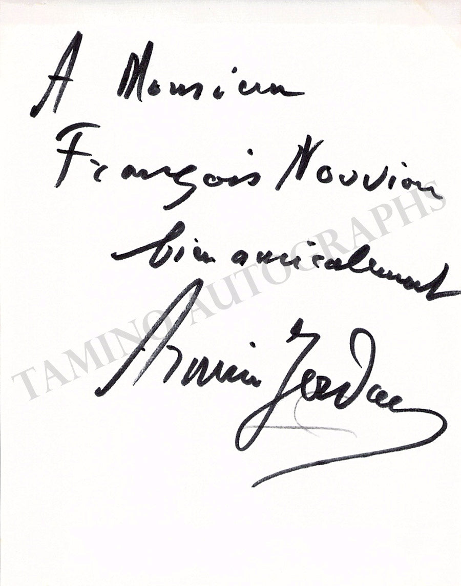 Fine black-and-white photograph signed and inscribed by him with a short sentiment in French on verso. Size is 3.4 x 4.4 inches, in excellent condition