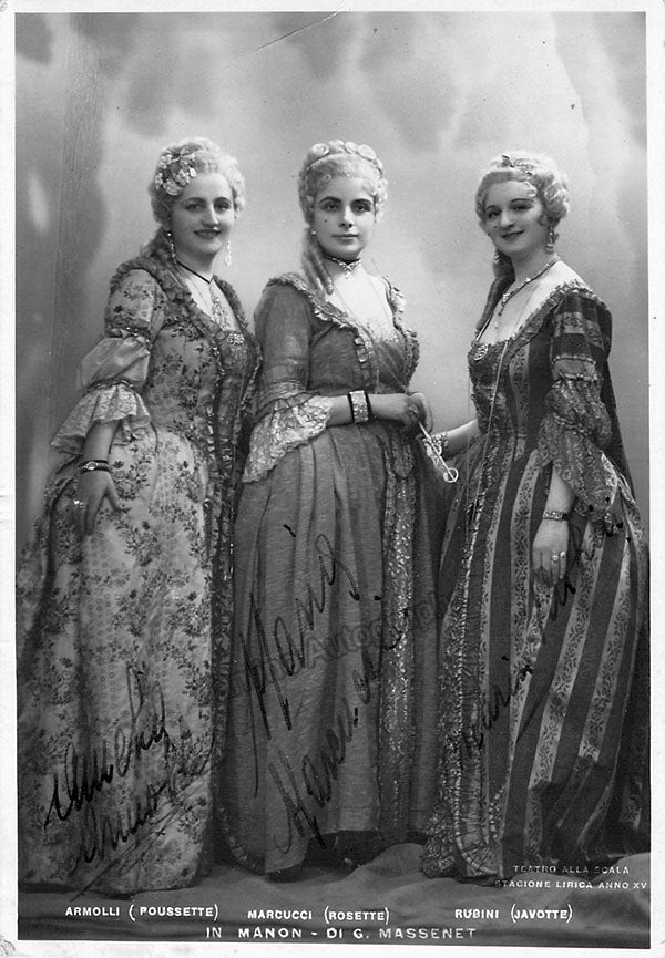 Italian soprano (1910-?), Italian mezzo-soprano (1910-1991), and Argentine soprano, triple signed postcard photograph, shown as Poussette, Rosette, and Javotte, respectively in Massenet's Manon. Photo by E. Martinotti, La Scala, Milan. Size is 4 x 5.75 inches, in very good condition.