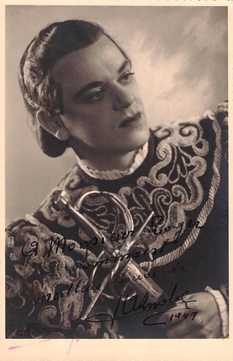 Belgian tenor (1919-1965), signed photo, shown in Gounod's Faust, dated in 1949, inscribed. Stamped on verso by photographer Henri Vermeulen, Theatre Royal de la Monnaie, Brussels. Size is 4.5 x 7 inches, in excellent condition.