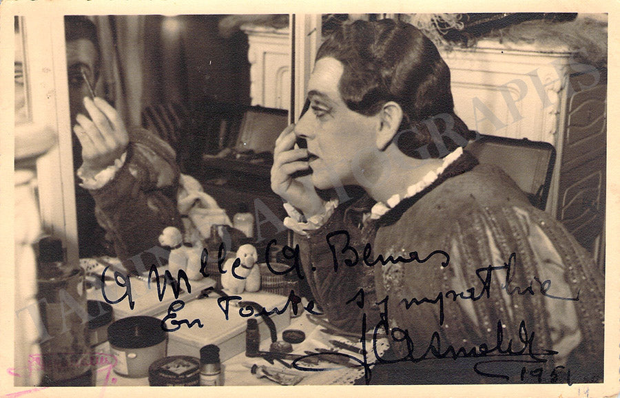 Belgian tenor (1919-1965), signed photograph, shown in role, backstage, inscribed, dated in 1951. Stamped on verso by photographer Henri Vermeulen, Theatre Royal de la Monnaie, Brussels. Size is 4.5 x 7 inches, in excellent condition.