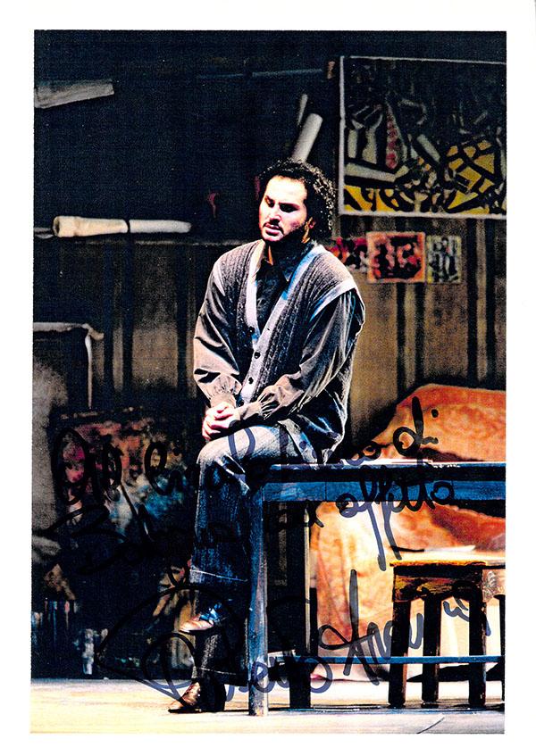 Italian tenor (b. 1969), signed photo, shown as Rodolfo in Puccini's La Boheme, inscribed. Attractive color photo of 5 x 7.5 inches, mounted onto paper of 6 x 8.25 inches, in excellent condition.