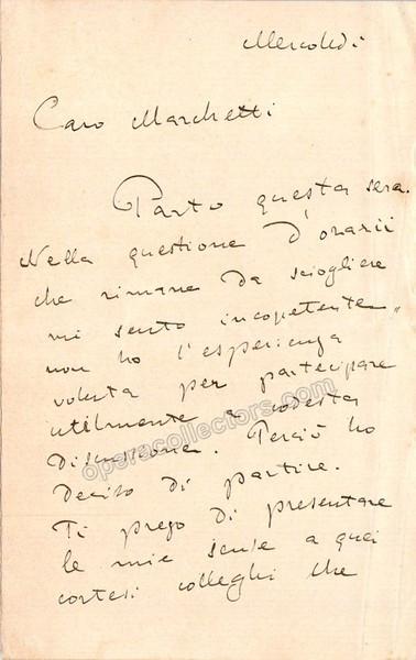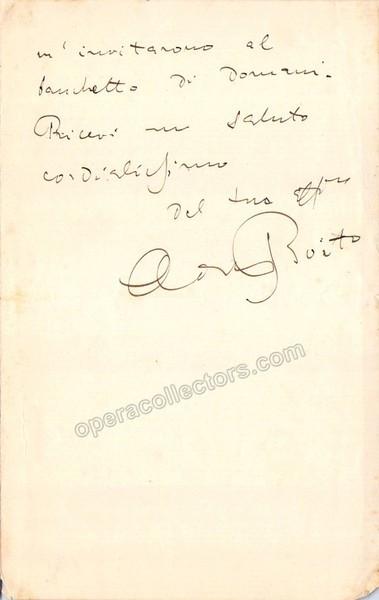 Italian composer, librettist, poet, journalist (1842-1918), well-known today for his work as a librettist for Verdi and his opera Mefistofele. Autograph note signed by him, no year written, with translation into English. Note refers about a trip and is in 2 pages. Size is 4.5 x 7 inches, in excellent condition
