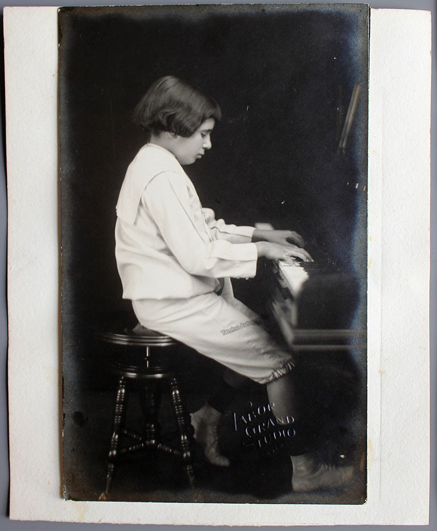 Sizes are 6.75 x 10 inches (music quote) and 4.75 x 7.75 inches (photo size, photo is on a 6.75 x 8.25 inch cardboard). Photo shows clear silvering, otherwise in excellent condition. Photo has a blind stamp by photographer "Labor Grand Studio - Denver".