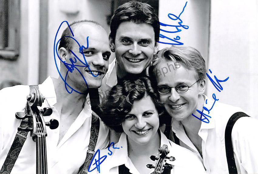 Famous German string quartet founded in 1989.  Beautiful larger size black and white photo signed by all four members.  Size is 12 x 8.25 inches, in excellent condition.
