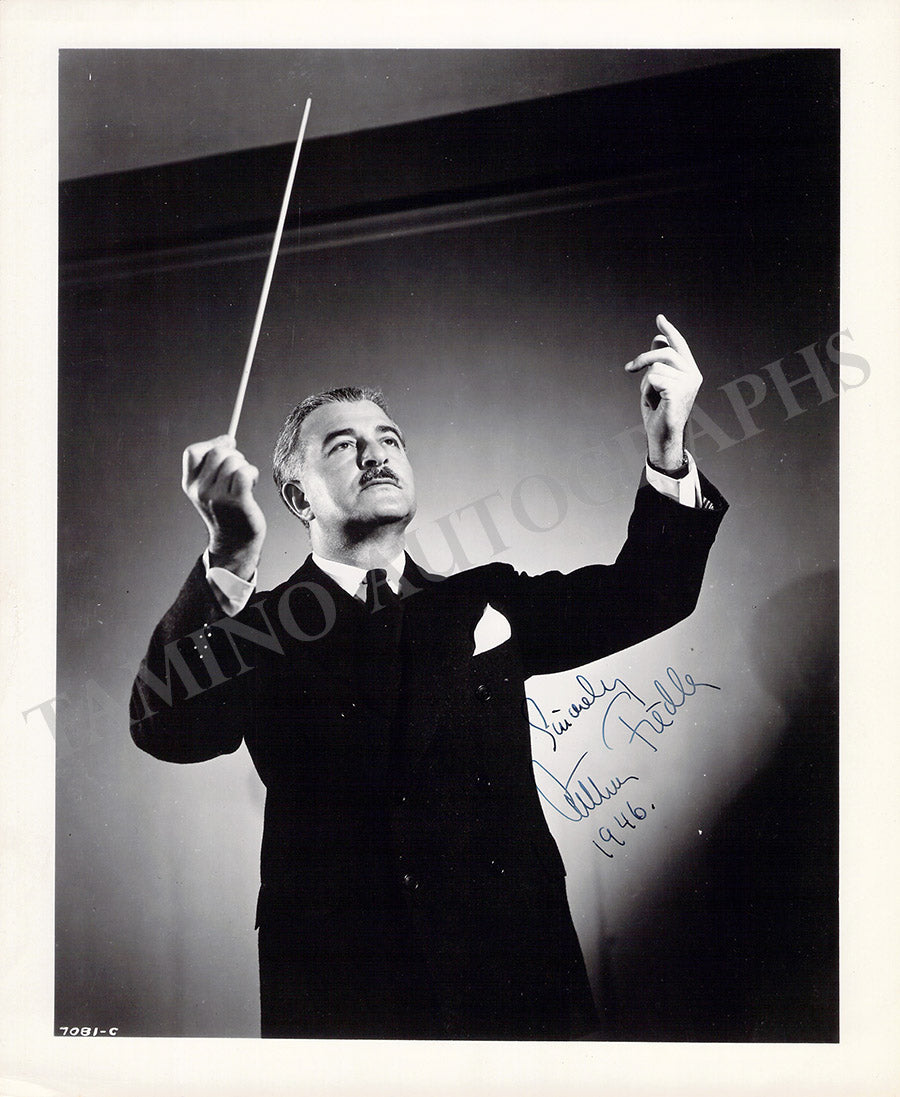 Nice black-and-white photograph signed by him with a short sentiment dated 1946, shown in a conducting pose. Size is 8.2 x 10 inches, in excellent condition.