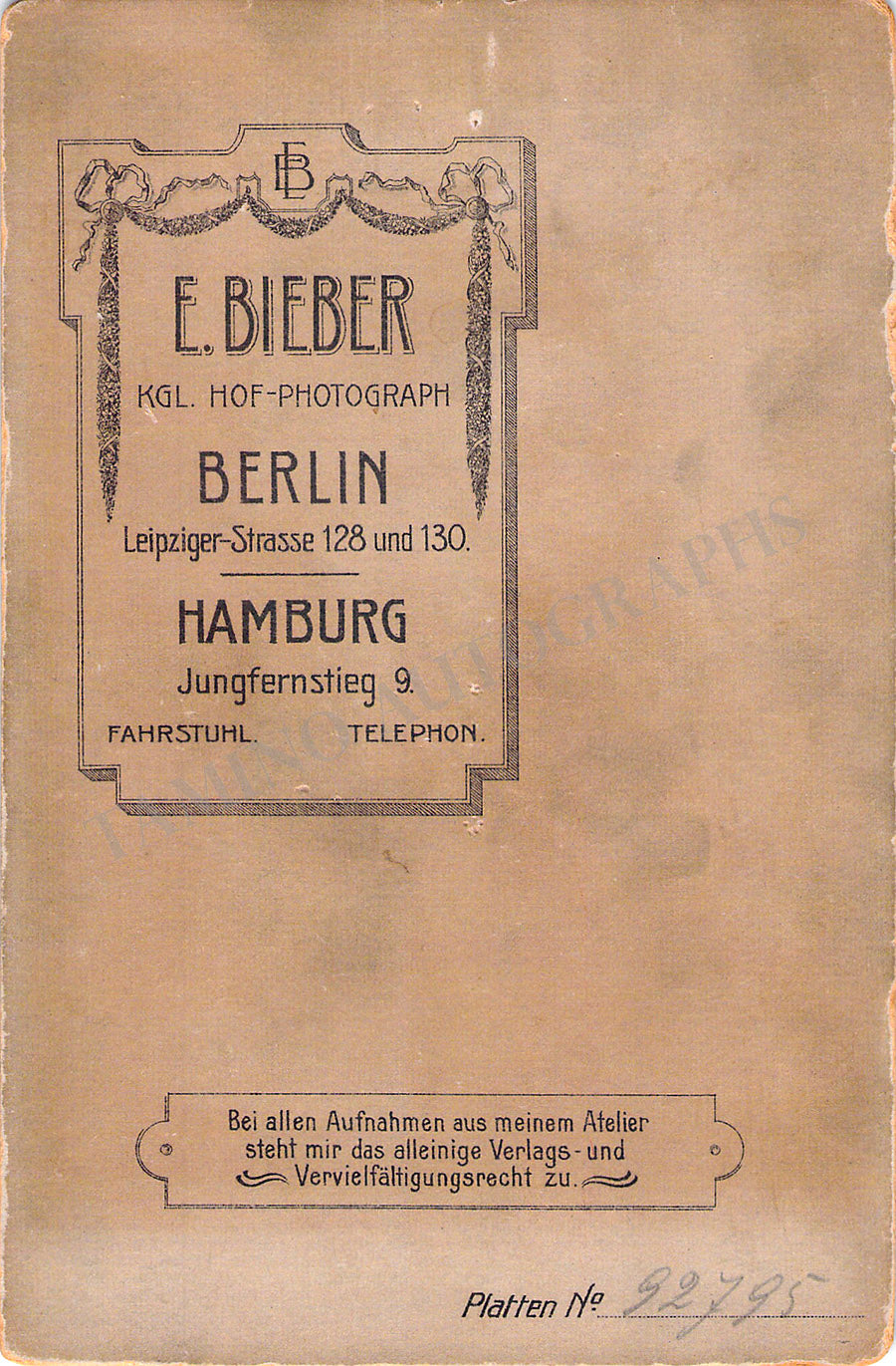 Gorgeous black-and-white cabinet photograph signed by him; stamped on verso by photographer E. Bieber (Berlin). Size 4.25 x 6.5 inches, minor scratch over the image, in overall very good condition.