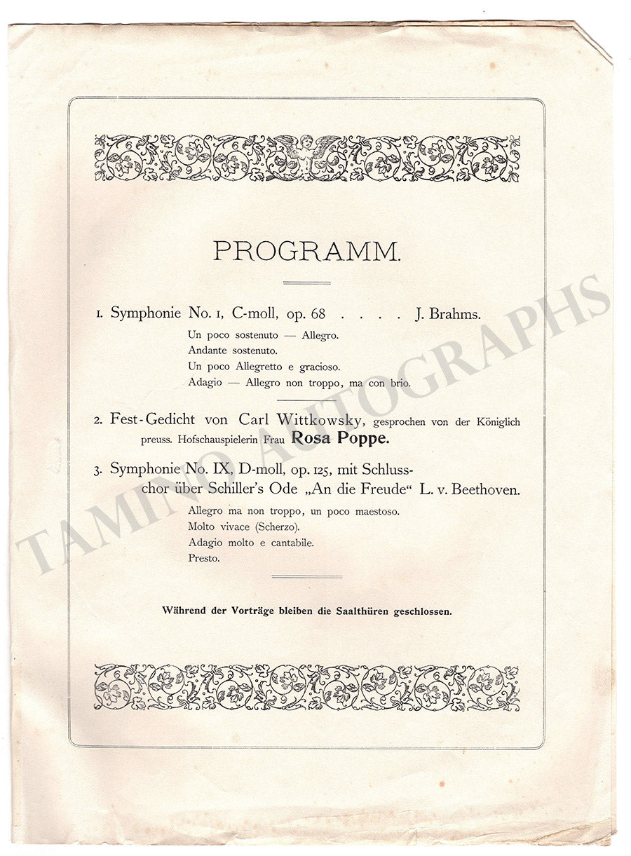 Program (unsigned) for a concert of the Berlin Philharmonic under the baton of Arthur Nikisch performing Brahms' Symphony No. 1 and Beethoven's Symphony No. 9 in Berlin, April 30, 1907.