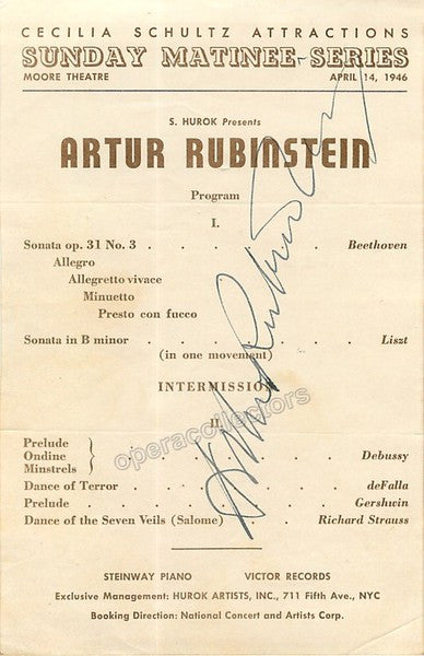 Concert program at Moore Theatre, 1946, 1 page signed across by the famous pianist. Size is 5.5 x 8.5 inches, in excellent condition