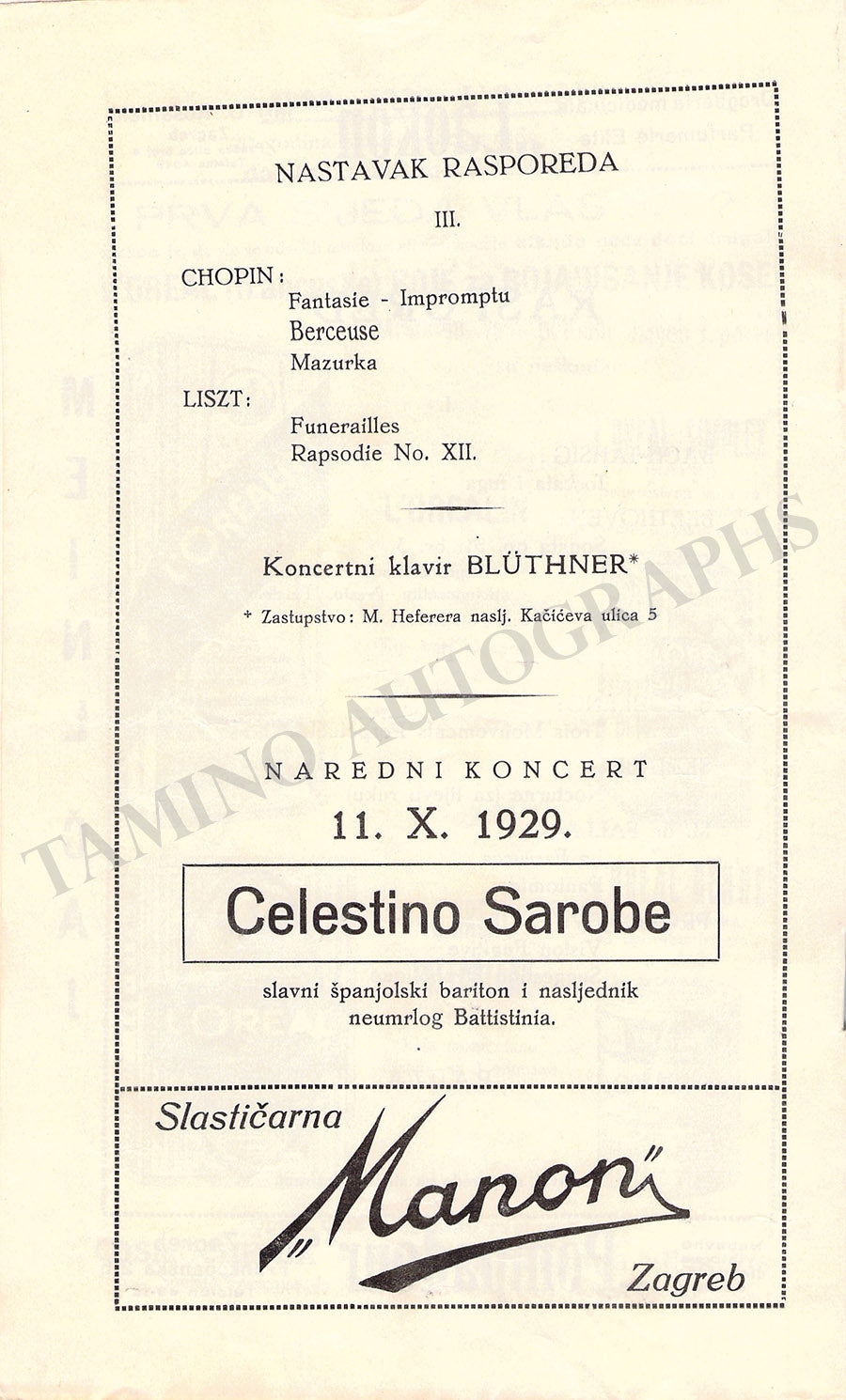 Rubinstein, Artur - Signed Program Croatia 1929 Rubinstein, Artur - Signed Program Croatia 1929 Rubinstein, Artur - Signed Program Croatia 1929