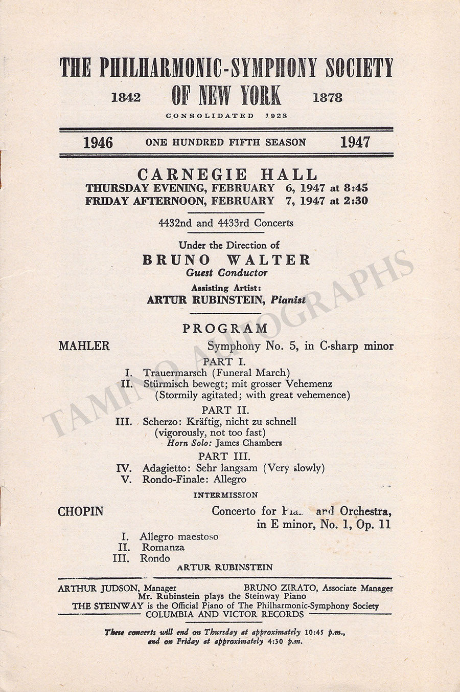 Program for a concert by the star Polish-American pianist performing Chopin's Piano Concerto No.1 at the Carnegie Hall, New York, on February 1947, with the New York Philharmonic under the baton of Bruno Walter. The program also includes Mahler's Symphony No. 5.