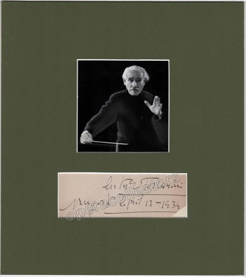 Italian superstar conductor (1867-1957), considered by many critics, fellow musicians, and much of the classical listening audience to have been one of the greatest conductors of all time. Large signature on album leaf, dated by him in New York in 1934, mounted on an acid-free mat with a photograph of him conducting. Sizes are 5.5 x 1.8 inches (visible window size) for the signed album leaf, 4 x 4 (visible window size) for the photograph, and 10.5 x 12 inches is the total mat size. In excellent condition, ready to frame if desired.