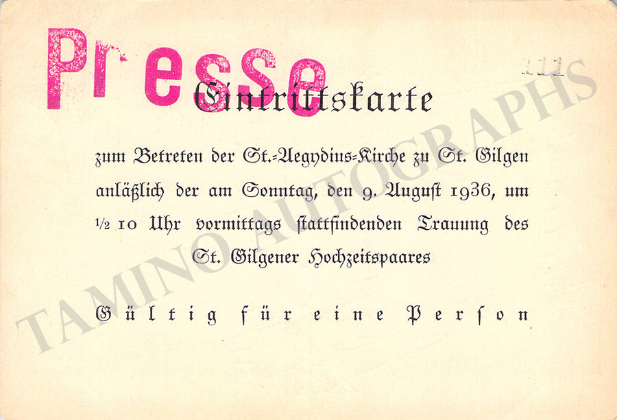 Small admission ticket in German for a concert in August 1939 at a church signed on verso by him and also by soprano Lotte Lehmann plus two other unidentifed signers. Size is 6 x 4.1 inches, central fold, in excellent condition.
