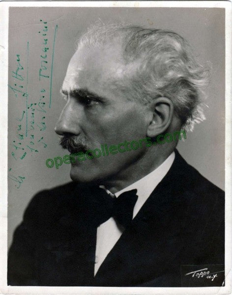 Italian superstar conductor (1867-1957), considered by many critics, fellow musicians, and much of the classical listening audience to have been one of the greatest conductors of all time. Fabulous signed photo, 8x10 inches, a rarity!, inscribed. Photo has a couple of barely visible creases, one near the top left, other near the bottom right).
