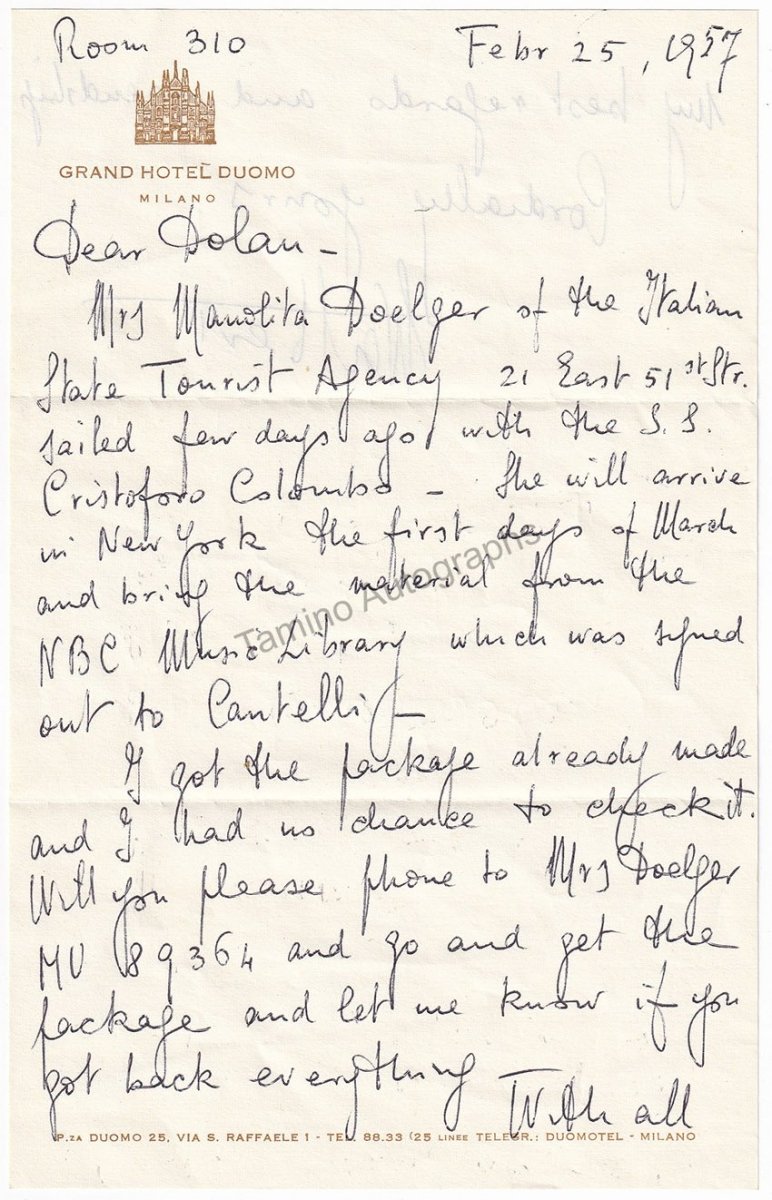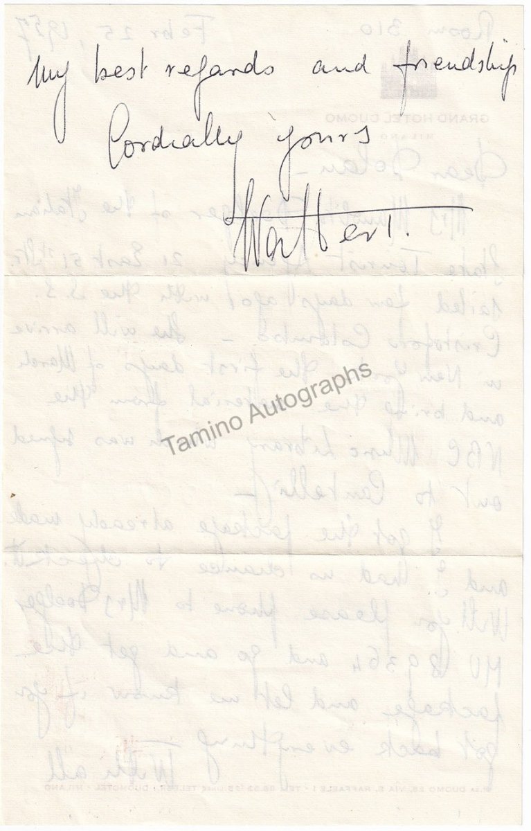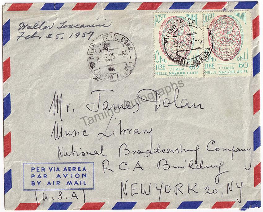 Also included is an autograph letter by Toscanini´s son Walter, sent to Dolan a month after Toscanini´s death in January 1957, with the envelope. Both items, baton and autograph letter, come from the estate of James Dolan, and are provided with a certificate of authenticity from us.