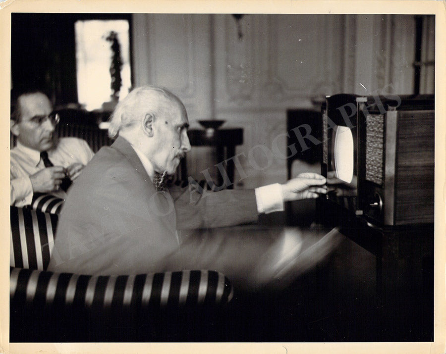 Beautiful photograph of the conductor tunning a radio, with his son Walter on the background. Photograph is ink-stamped on verso twice, in excellent condition.