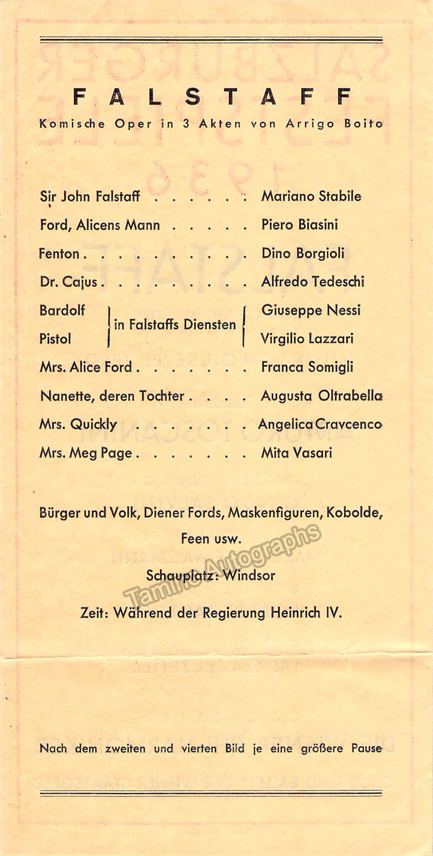 Trifold unsigned program for a performance of Verdi's opera "Falstaff" at the Salzburg Festival during the 1936 edition, starring Mariano Stabile, the Vienna Philharmonic under the baton of the celebrated Italian conductor.  Each page is 4.5 x 8.9 inches, in excellent condition.