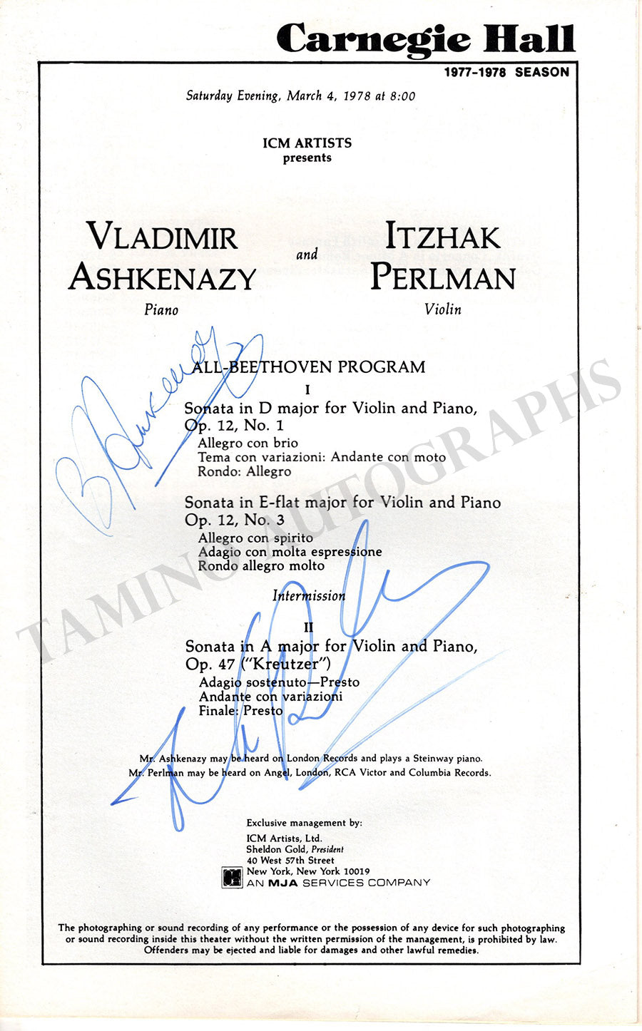 Original program for an All-Beethoven recital at Carnegie Hall, New York, March 3rd, 1978, performed by celebrated pianist Vladimir Ashkenazy and violinist Itzhak Perlman, and signed by both artists.