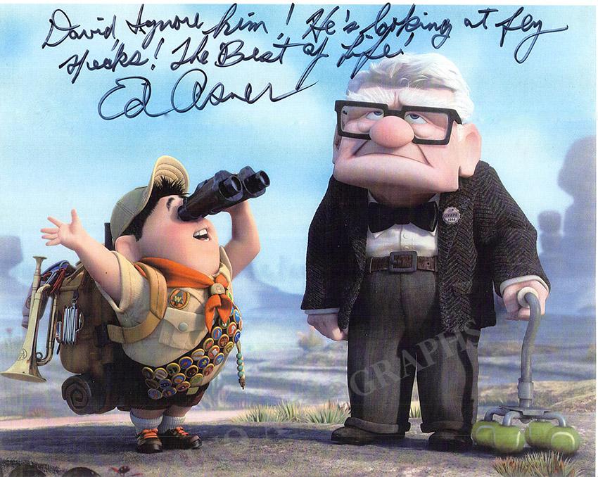 American actor and voice actor (b.1929), active in films since 1957. Signed movie still from the film "Up" (2009) in which he made the voice for the character of Carl Fredricksen, including a text quote. Size is 10 x 8 inches, in excellent condition.