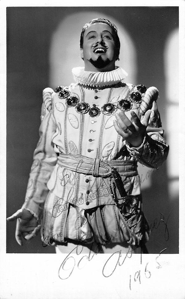 Spanish tenor and teacher (1919-1998), signed photo, shown in Rigoletto, inscribed and dated in 1965. Size is 3.25 x 5.25 inches, in excellent condition.