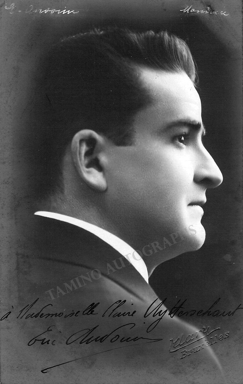 Nice black-and-white photo postcard signed and inscribed by him, shown as himself; blind-stamped on the front by photographer Klary (Brussels). Size is 3.3 x 5.3 inches, some silvering, in overall very good condition.