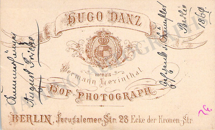 Vintage Carte-de-visite (CDV) of him by photographer Hugo Danz (Berlin). Size is 2.3 x 3.9 inches, ink-markings on verso, otherwise in excellent condition.