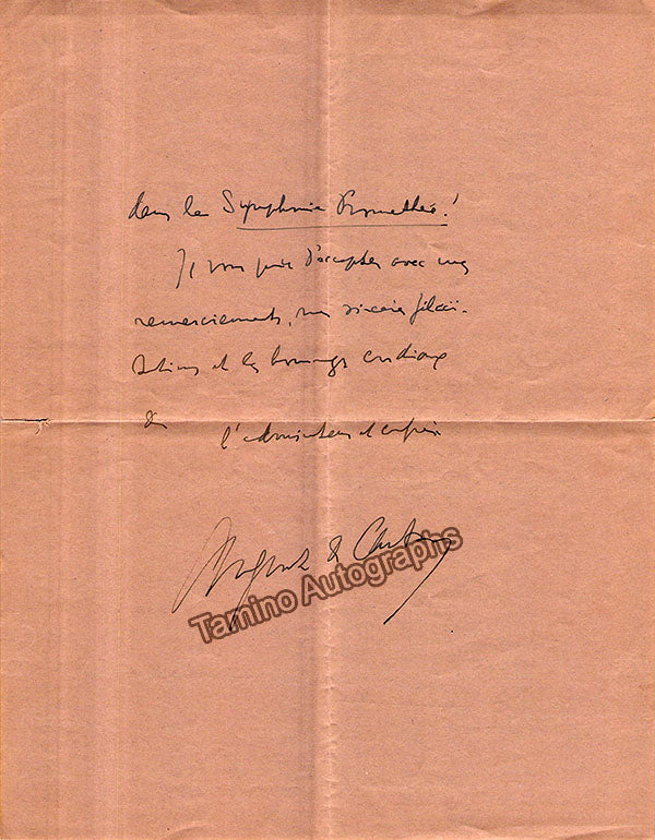 Portuguese journalist, author and diplomat (1883-1971), wrote numerous novels, short stories, plays, and essays, but was best known for his outspoken editorials.  Autograph letter signed, 2 pages composed in Brussels in 1935, written in French, sold with a 1 page typed French transcription. The original letter is 8.25 x 10.75 inches, folded with a small tear on the right edge, otherwise in very good condition. Transcription is 4.75 x 8.25 inches, with some markings and additions in blue ink, and is in excellent condition.