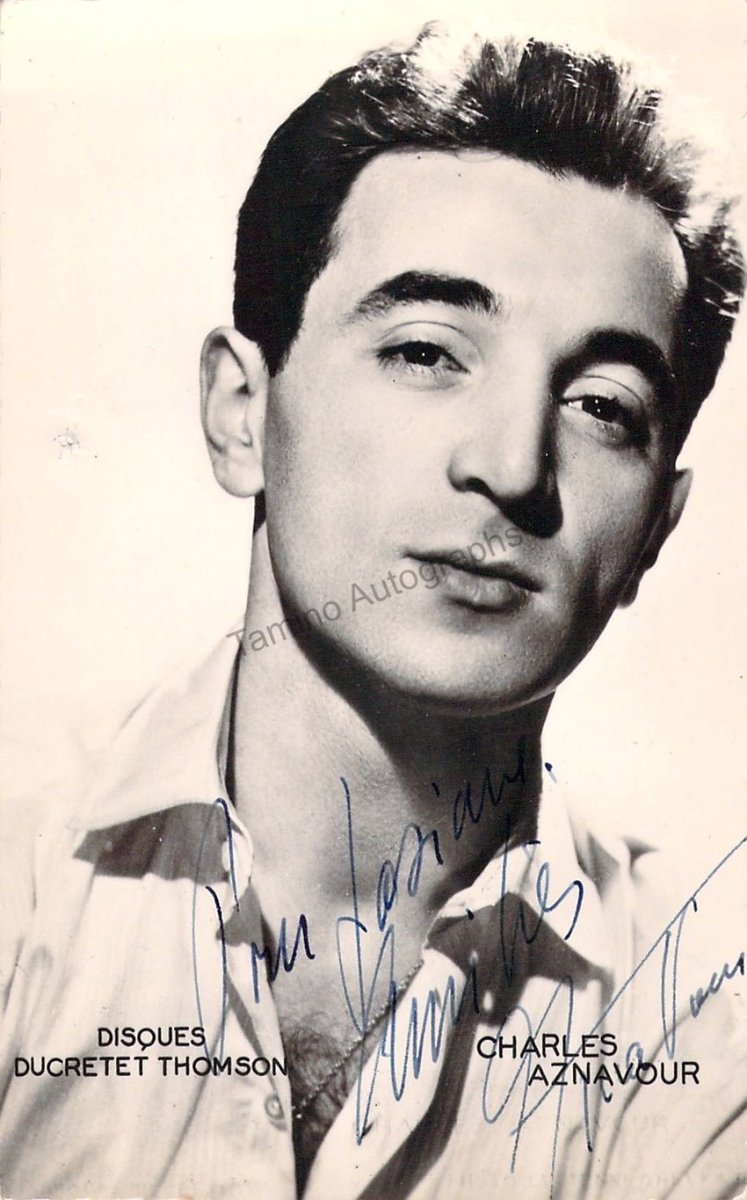 French-Armenian singer (1924-2018), lyricist, actor, and diplomat, who enjoyed a successful career spanning more than six decades. Beautiful promo photograph signed by him, shown young around the 1950s. Size is 3.4 x 5.4 inches, one small pinhole over the upper border, in excellent condition.