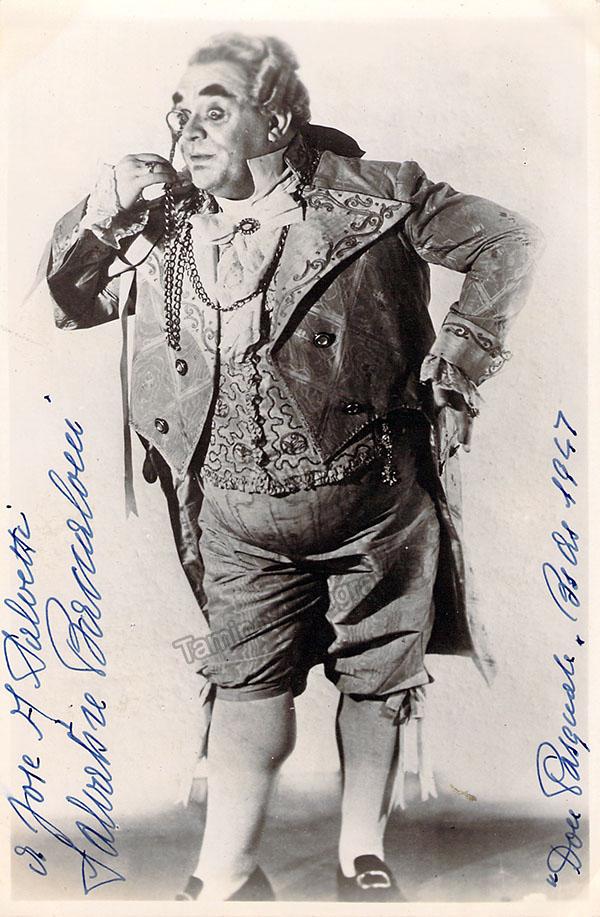 Italian bass (1900-1969), famous for his interpretations of buffo roles in opera. Signed photo, shown in title role of Donizetti's Don Pasquale. Inscribed and dated in 1947. Stamped on verso by Carmen Fotografias. Size is 4.7 x 7 inches, some bending on edges but otherwise in very good condition.
