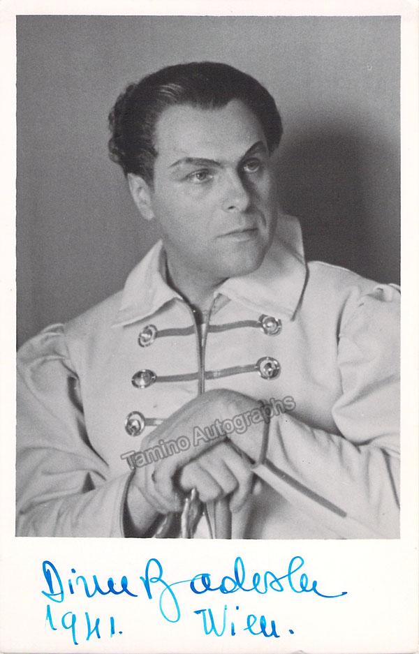 Romanian tenor (1904-1980), signed photo postcard, shown in role. Signed in Vienna, dated in 1941. Stamped on verso by photographer Macku, Vienna. Bold signature in attractive blue ink. Size is 3.5 x 5.5 inches, in excellent condition.
