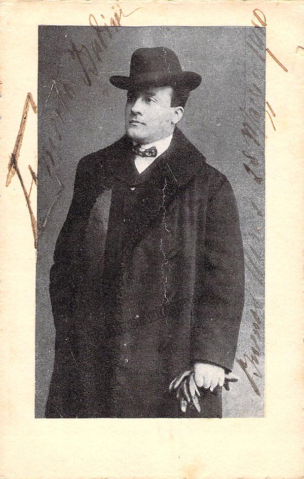 Italian baritone (1876-1937), signed half-tone photo attached to postcard, shown as himself. Dated in Buenos Aires in 19140.  Photo size is 2.75 x 4.5 inches, total item is 3.5 x 5.5 inches, jagged edges but otherwise in excellent condition.