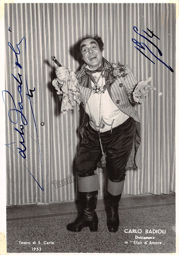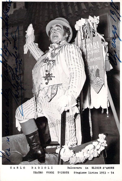 Signed photograph, shown as Dulcamara in Donizetti's Elisir D' Amore at the Teatro Di San Carlo, dated in 1954. Size is 4 x 5.75 inches, with slight rust on left corner and some bending at corners but otherwise in very good condition.