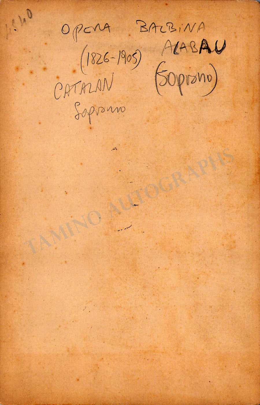 Original cabinet-style (unsigned) photograph of the soprano (shown playing the guitar) by photographer Antoni Esplugas (Barcelona). Size is 4.25 x 6.5 inches, some rust stains on the front, blank verso with some ink markings and spotted rust; in overall excellent condition.