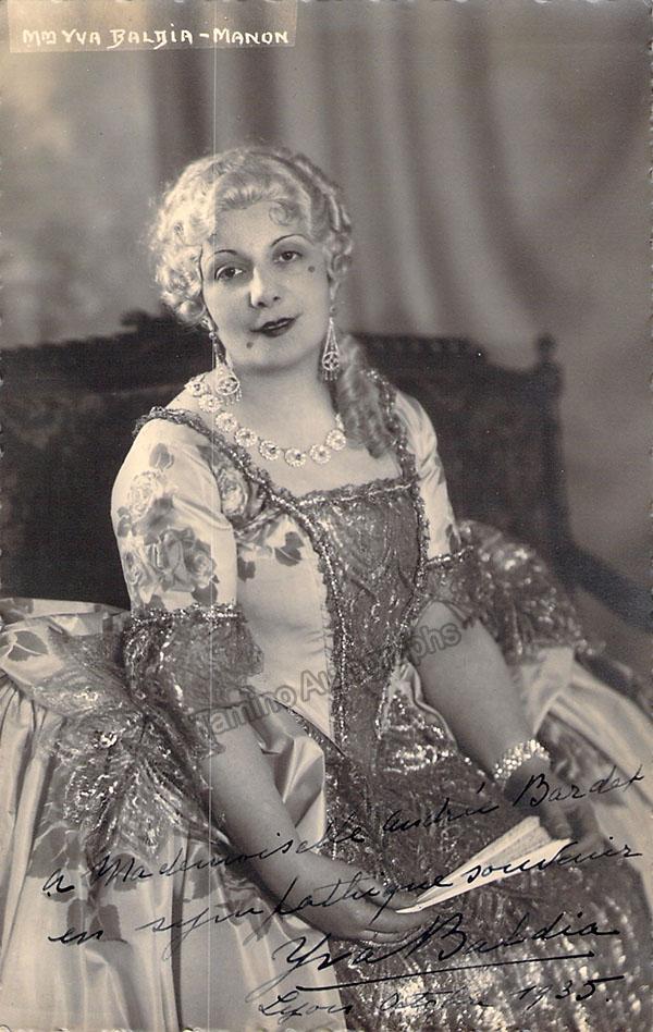 French soprano (dates unknown), shown in title role of Massenet's Manon, signed and inscribed in Lyon, dated in 1935. Stamped on verso by photographer. Size is 3.4 x 5.4 inches, very slight silvering not affecting the image or signature and mounting traces on verso but otherwise attractive vintage item in excellent condition.