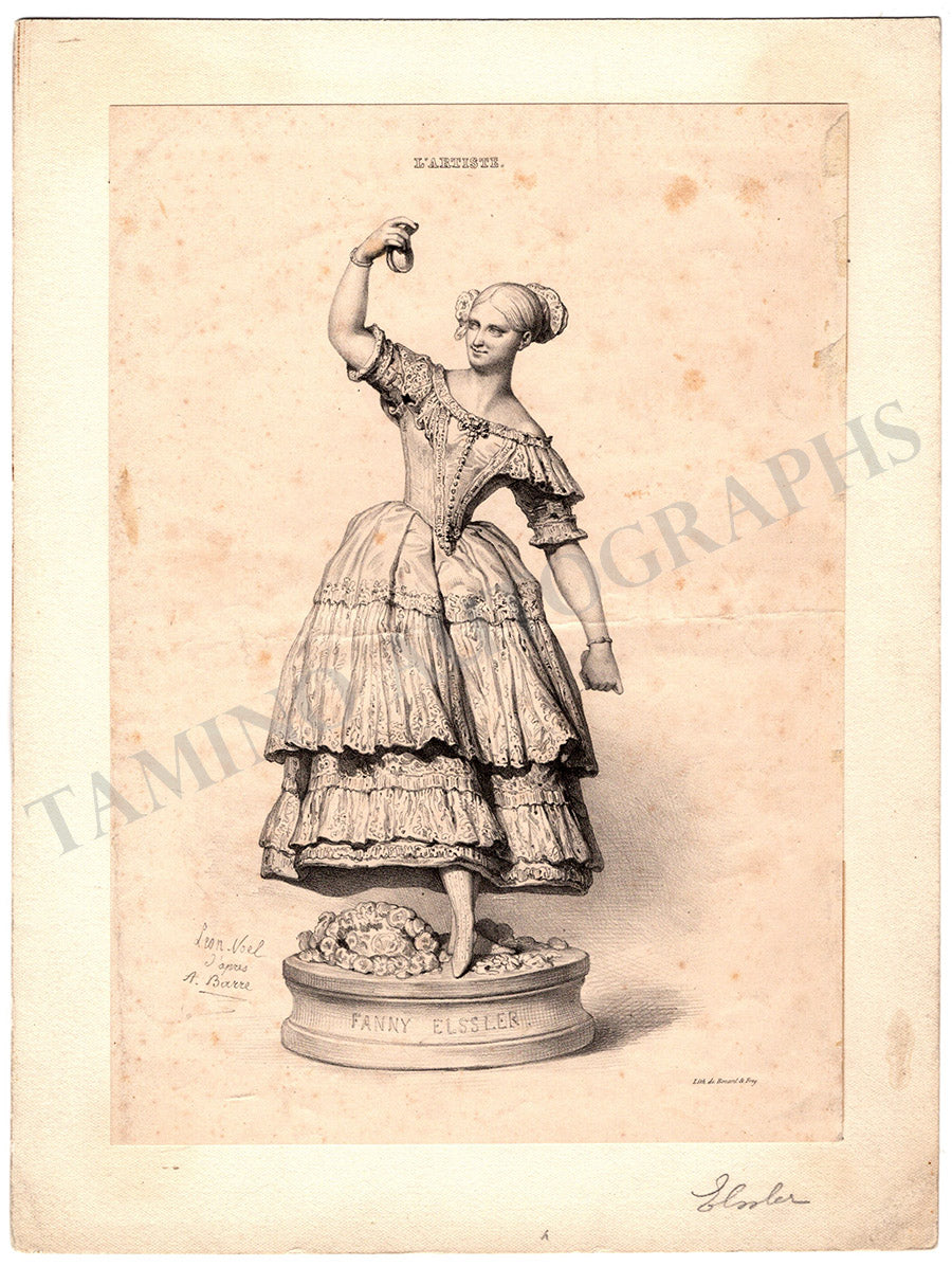 Vintage lithograph of a statue/figurine of Elssler by Benar & Frey mounted on soft cardboard. Total size is 9.25 x 12.2 inches, lithograph's actual size is 7.25 x 10.2 inches, rust stains, in very good condition.