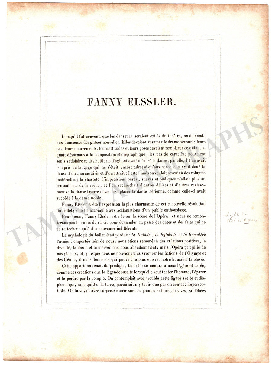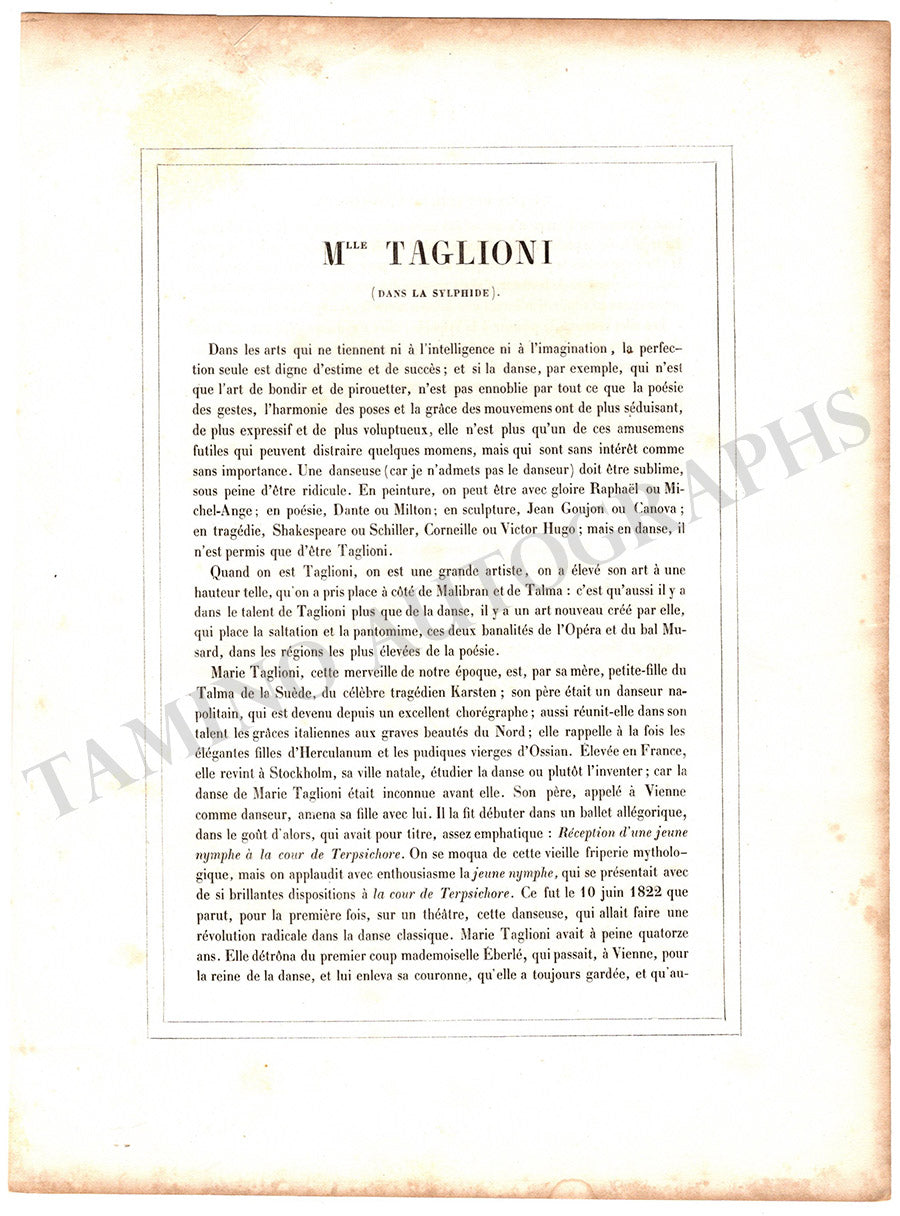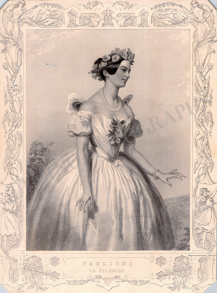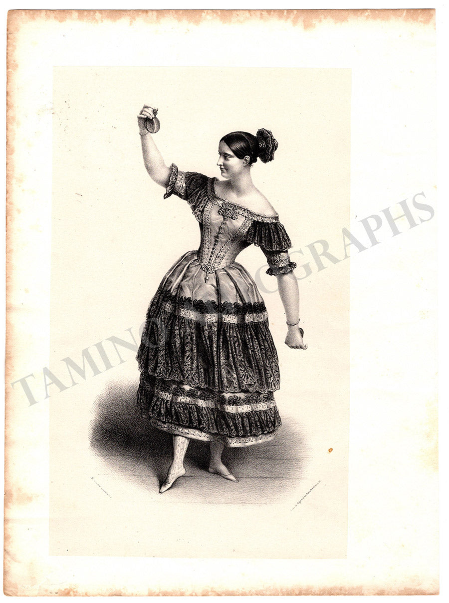 Nice XIX-century lithograph of the ballerina shown in 'La Sylphide'. Size is 6.3 x 8.6 inches (trimmed corners), in very good condition.