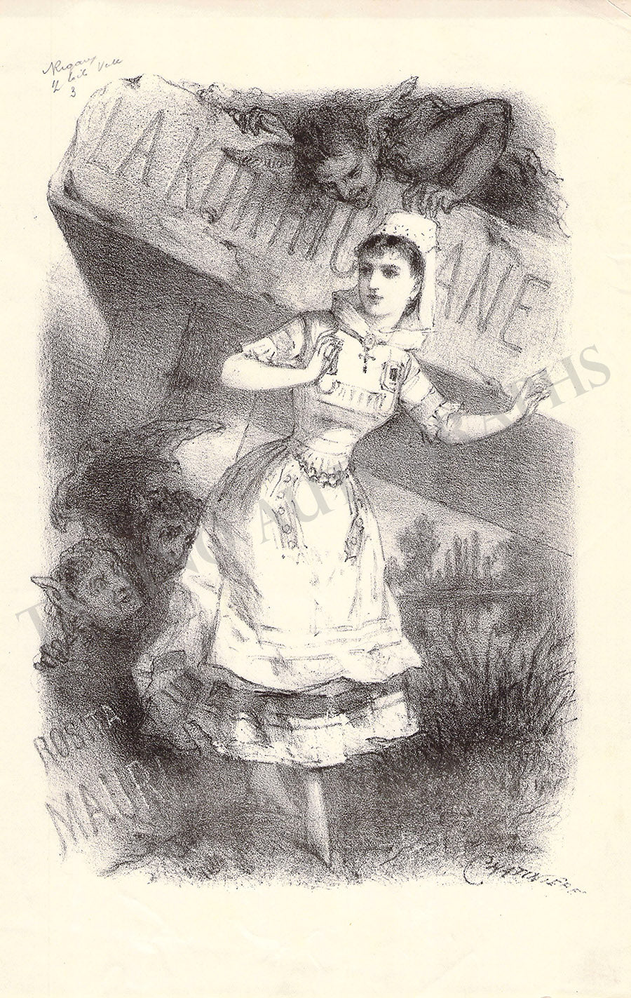 XIX-century lithograph by Rigo Freres (Paris). Size is 8.75 x 11.75 inches, rust stains over all four corners, in very good condition. ALSO INCLUDED is a 4-page biographical article in French about her.