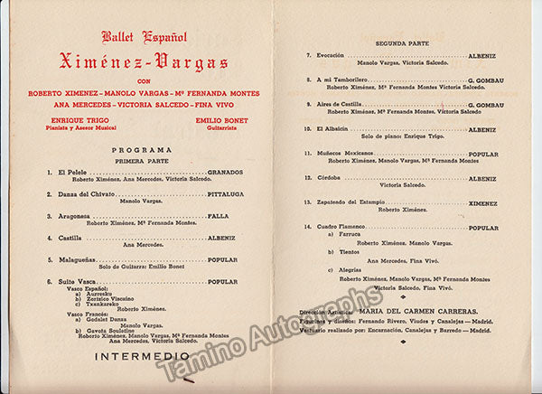 Program for a performance of the Ballet Espanol (Spanish Ballet) at SPAM -Sociedad Pro Arte Musical, Havana, Cuba, on February 23rd, 1955, signed on the front cover by members of the Ballet including Fernanda Montes, Fina Vivo, Ana Mercedes, and Victoria Salcedo.  Size is 5.6 x 8.6 inches, 4 pages, in excellent condition.