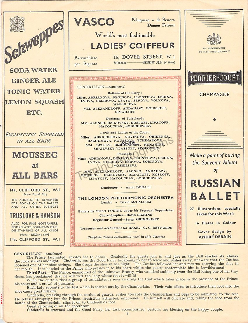 Program for a performance of the Ballet Russe with the London Philharmonic Orchestra at the Royal Opera House, Covent Garden in 1938. Program has many signatures on the cover by members of the ballet company including Kira Strakhova, Anton Vlassoff, Serge Bousloff, Sono Asato, Narcisse Matouchak, Edouard Dzikovsky, Roman Jasinsky, Alexandra Denisova, Marian Ladre, Lorand Andahazy, Dimitri Rostoff, Harcourt Algeranoff, Boris Belsky, Borislav Runanine and others. Size is 7.25 x 9.5 inches, 12 pages plus covers, some wear, in overall good condition.