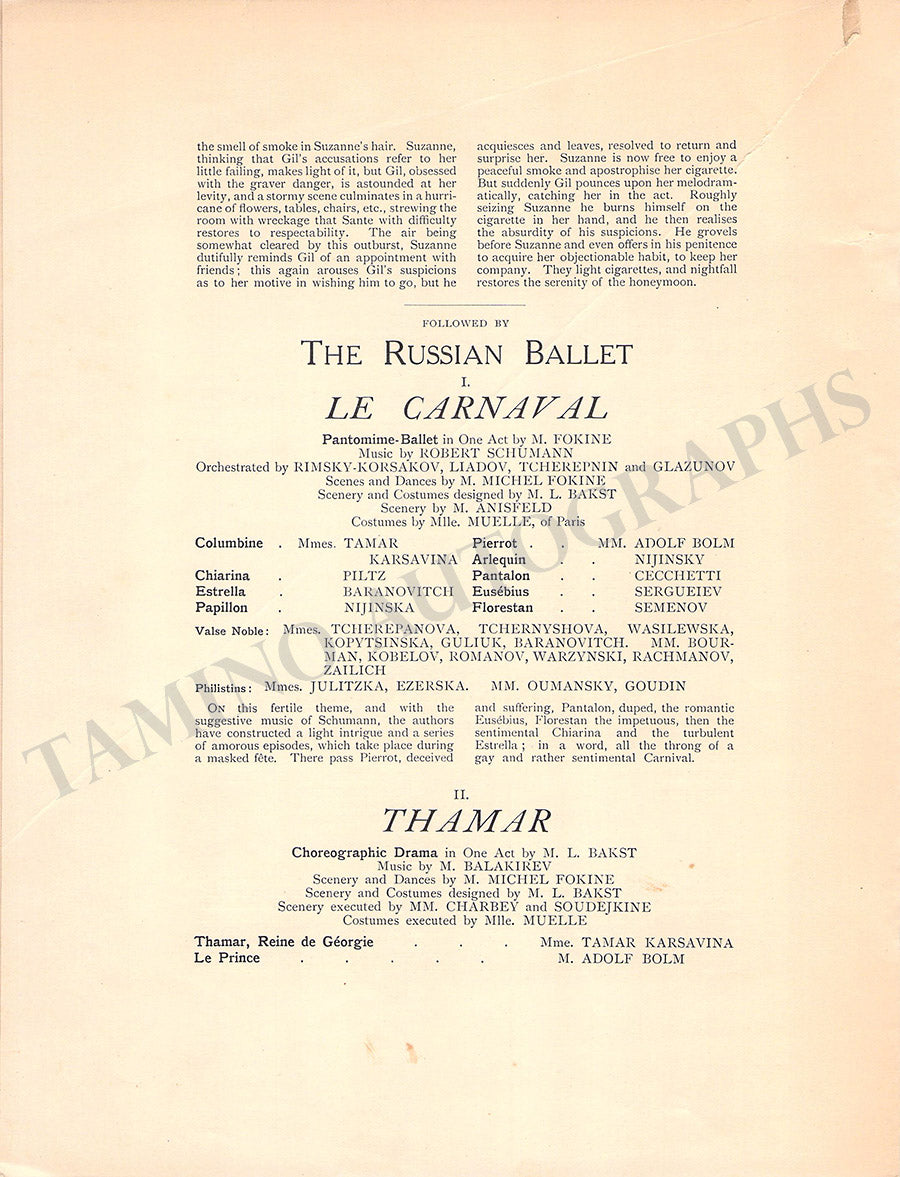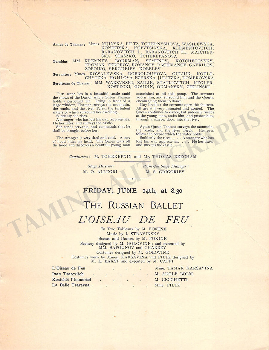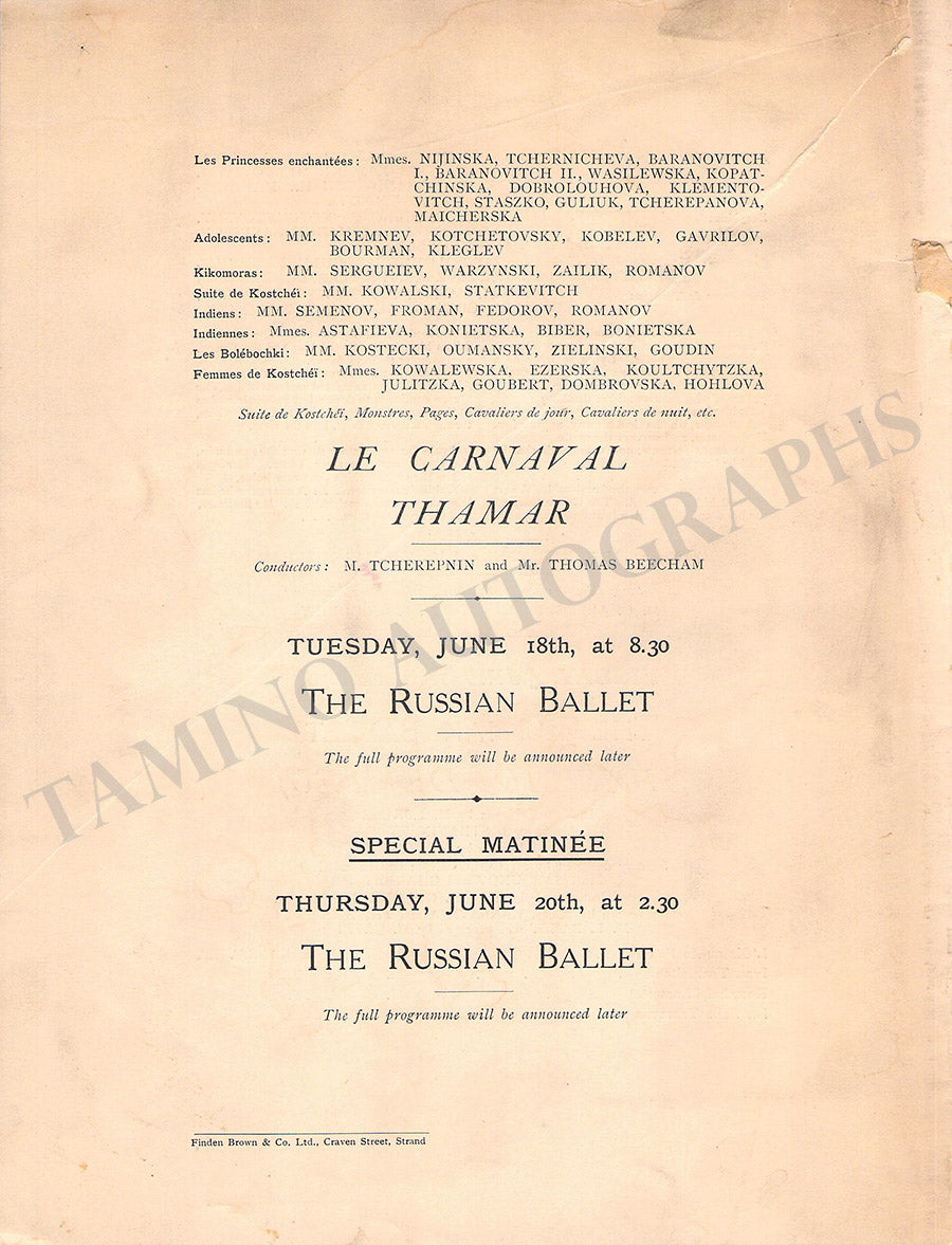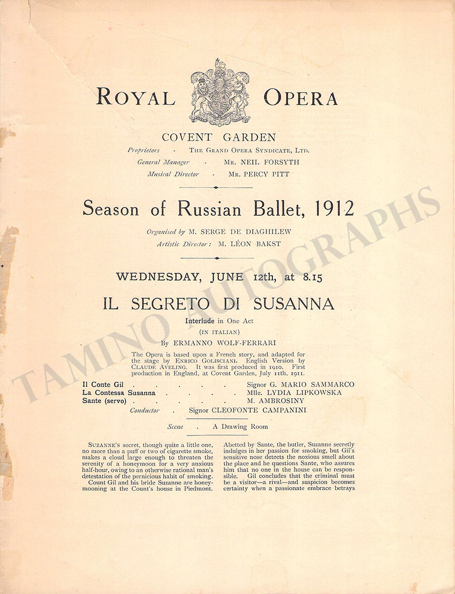 Program for a performance of the famous ballet company at The Royal Opera House, Covent Garden, London, on June 12, 1912, featuring Tamara Karsavina and other artists. Size is 7.2 x 9.4 inches, major crack over the upper-left corner, otherwise in good condition.