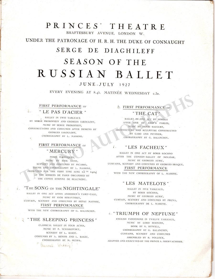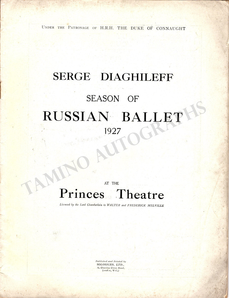 Program for performances of the Ballet Russes Diaghilev at the Princes' Theatre in London, on June/July 1927, with a cast of superstars dancers including Alexandra Danilova, Georges Balanchine, Leonide Massine, Serge Lifar, Stanislas Idzikowsky, and others.