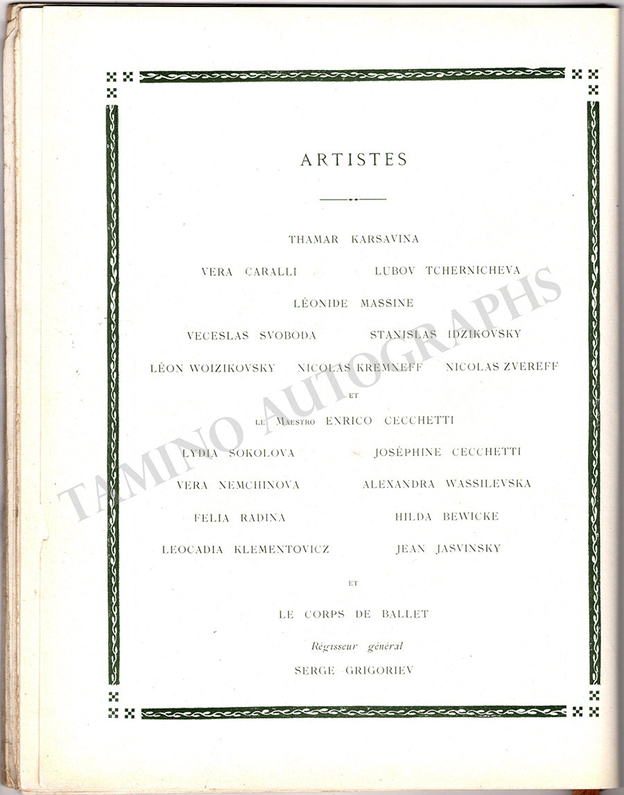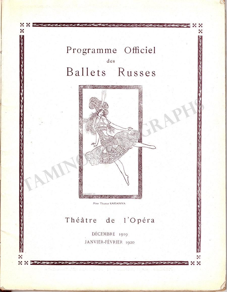 Program for performances of the Ballet Russes Diaghilev in Paris at the Theatre de l'Opera during the Ballet season between December 1919 and February 1920, with a cast of superstar dancers including Karsavina, Tchernicheva, Massine, Idzikowsky, Svodoba, Sokolova, Kremneff, and others.