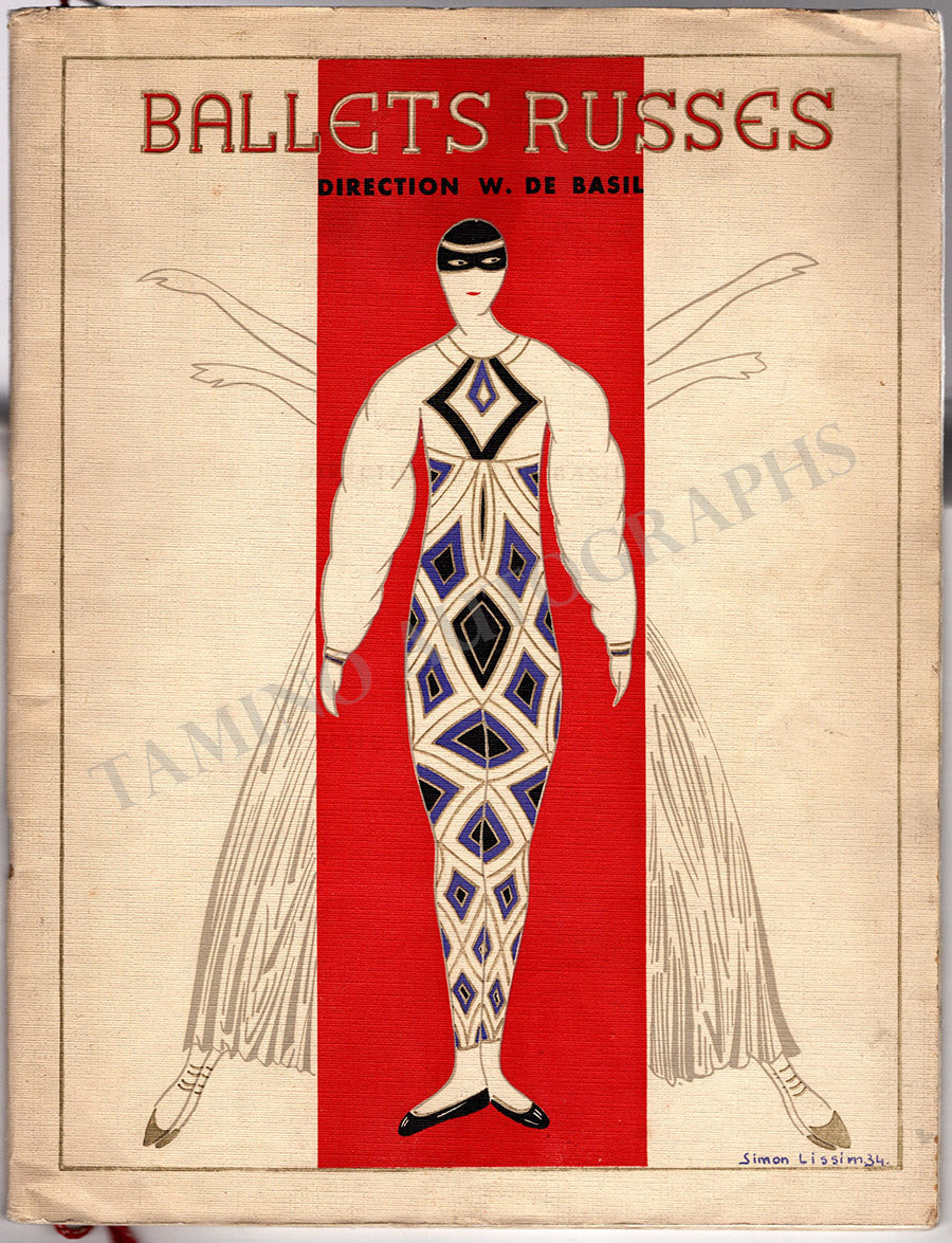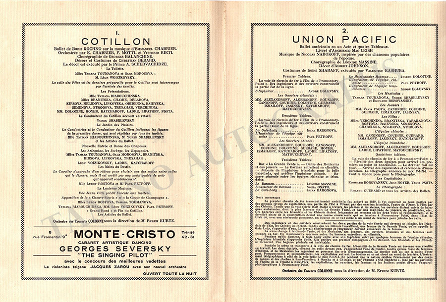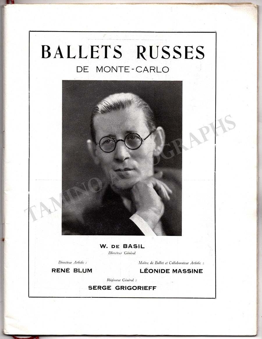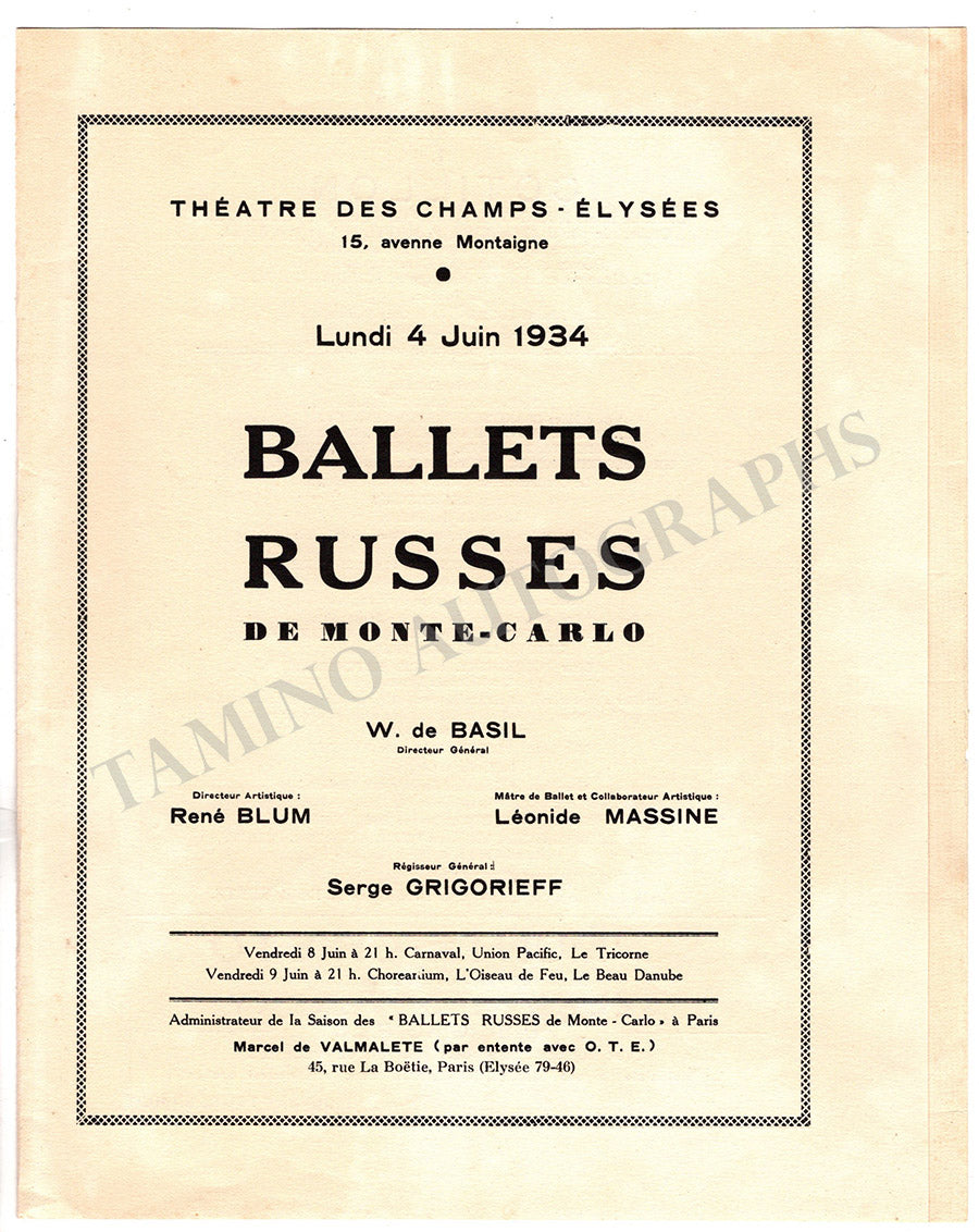 Program for a performance of the company on June 4, 1934, at the Théatre Des Champs-Élysées, Paris. Size is 9.5 x 12.5 inches, some creases and stains on the front cover, otherwise in excellent condition.