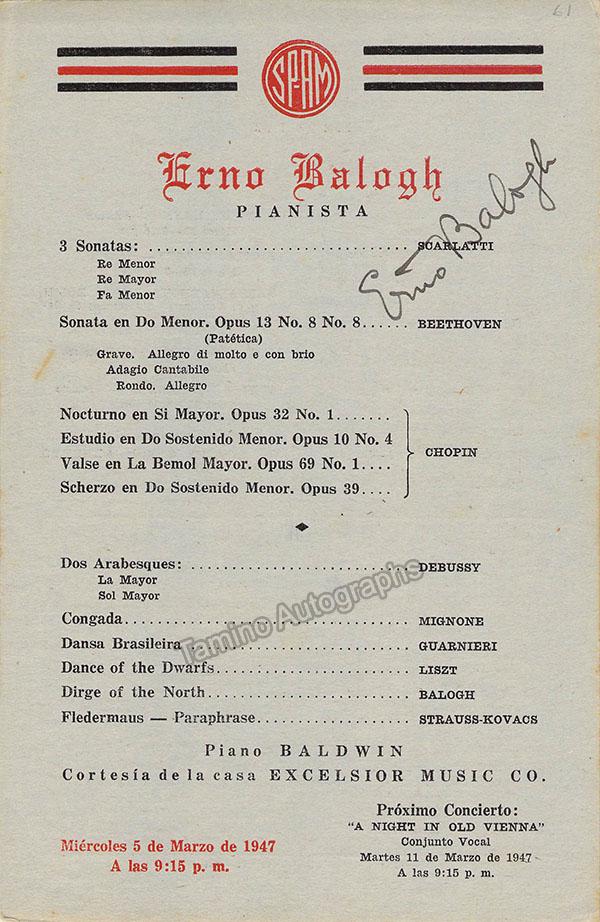Program for a concert at Sociedad ProArte Musical, Havana, 1947, signed by the pianist. One-sheet program printed on both sides. Size is 5.5 x 8.5 inches, in excellent condition.
