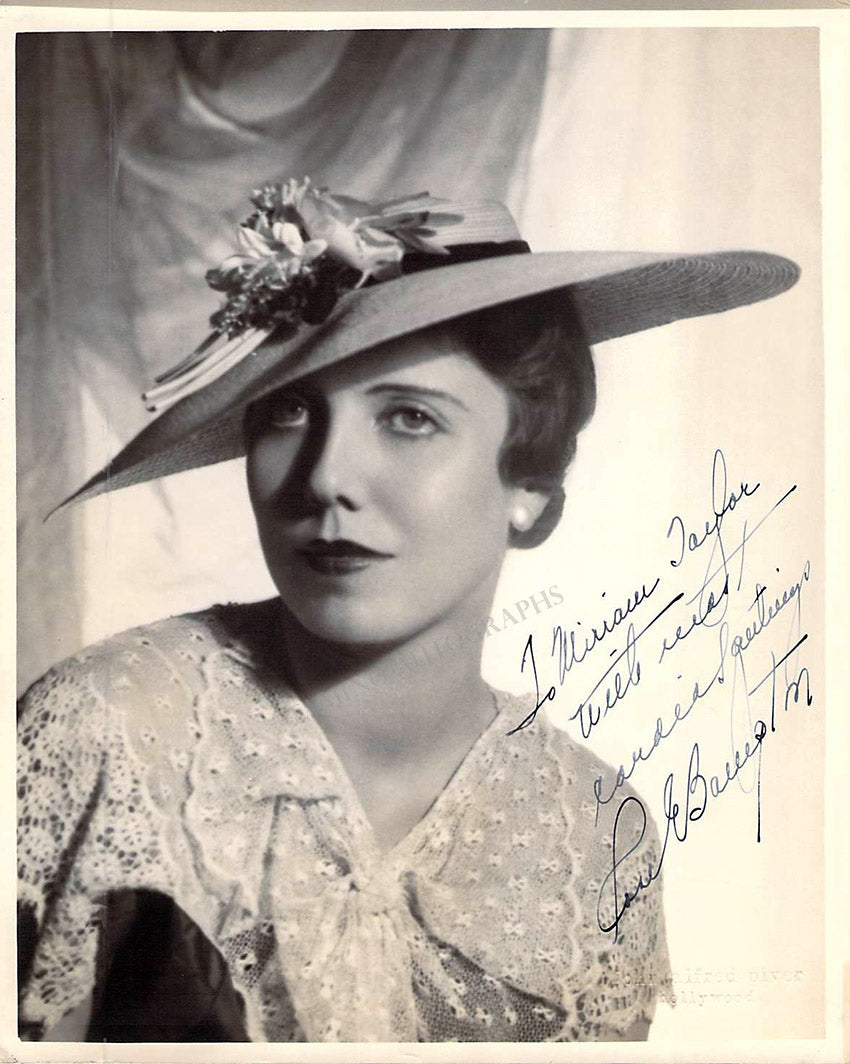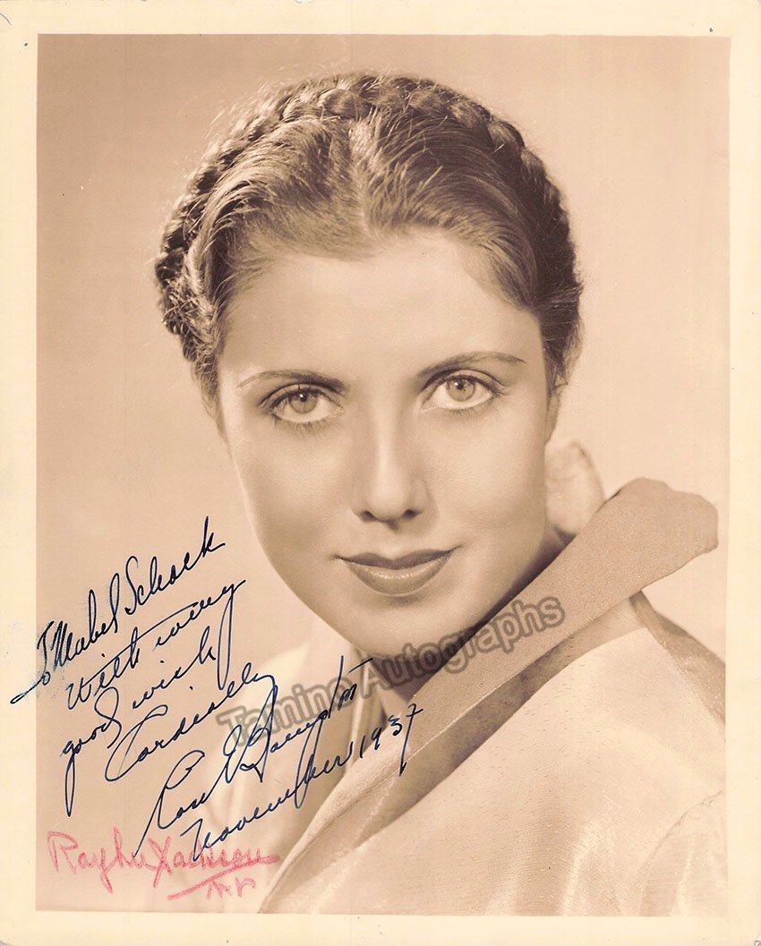 Gorgeous black-and-white photograph signed and inscribed by her with a short sentiment; blind-stamped on the front by photographer John Alfred Piver (Hollywood). Size is 7.9 x 9.8 inches, minor damage over the top, otherwise in excellent condition.