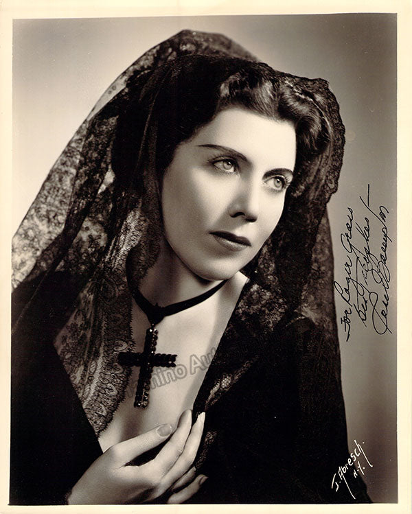Nice sepia photograph signed and inscribed by her with a short sentiment dated 1954, shown as Tosca in Puccini's opera; ink-stamped on verso by photographer James Abresch (New York). Size is 7.9 x 9.8 inches, minor mounting traces on verso, otherwise in excellent condition.